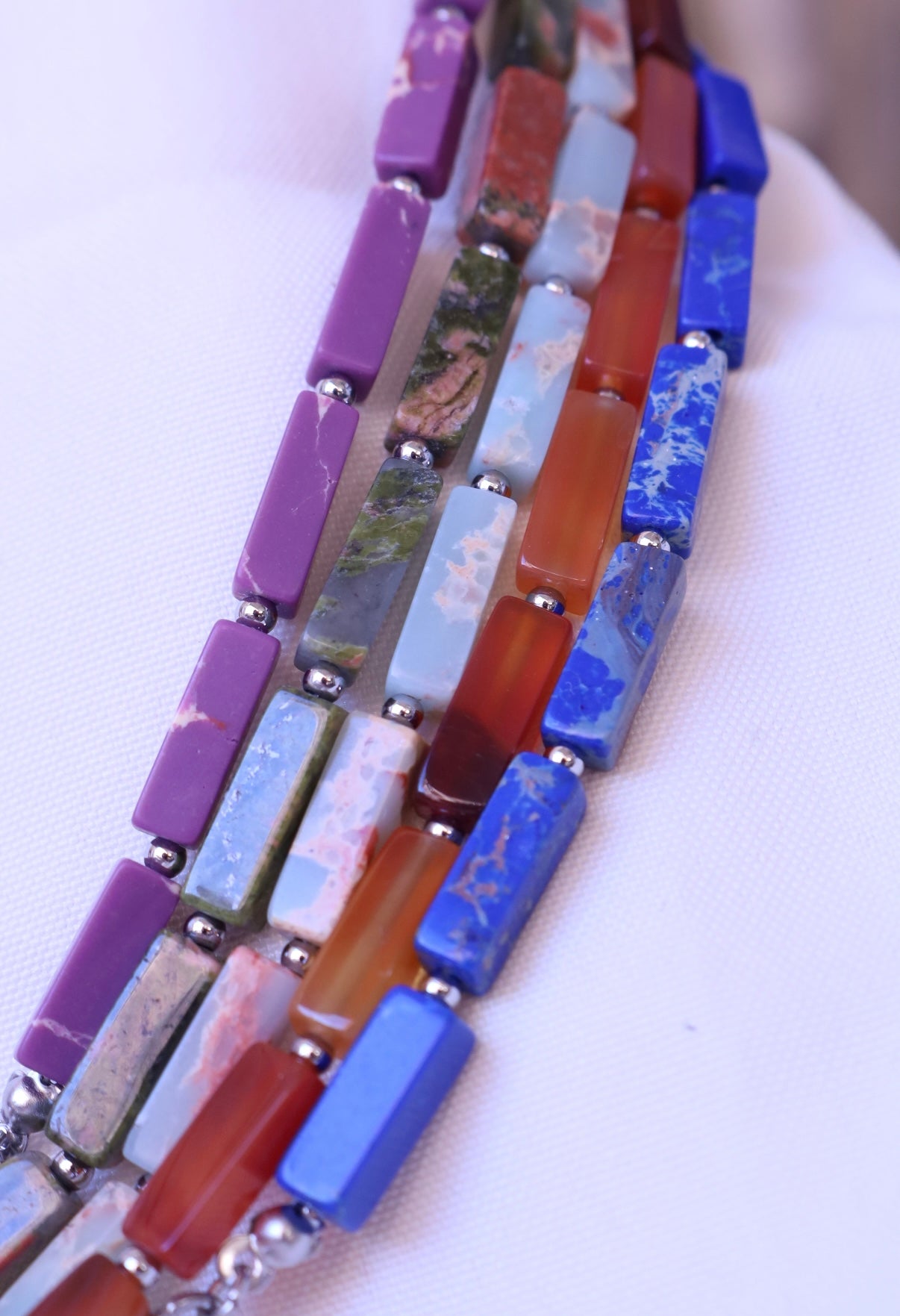 Composta da pietre vere in forma di tubetti, alternate a dettagli in acciaio inox, unisce l’eleganza grezza della natura con un’anima contemporanea e resistente.